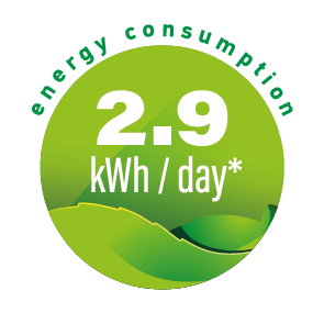 Erittäin edullisen energiankulutuksen ansiosta tämän 5-hengen mallin päivittäinen kulutus on pienentynyt erittäin paljon, 2,9 kWh:iin.